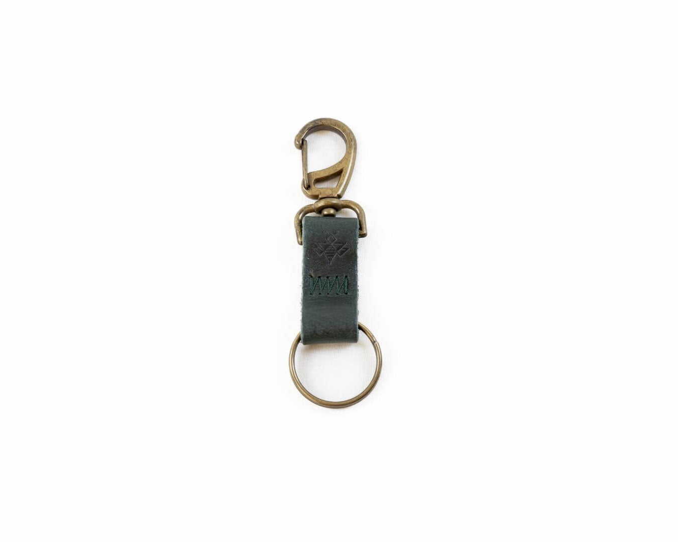 Our new limited edition keychain color. Featuring antique brass hardware, an old-fashioned swivel lobster clip, and stamped leather, this lil forest green leather keychain fits the essentials. Perfect for easy access to your keys — hook her on the o-ring of your Bee or belt loop.