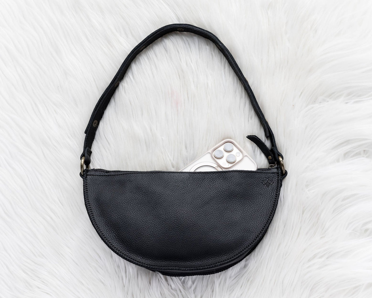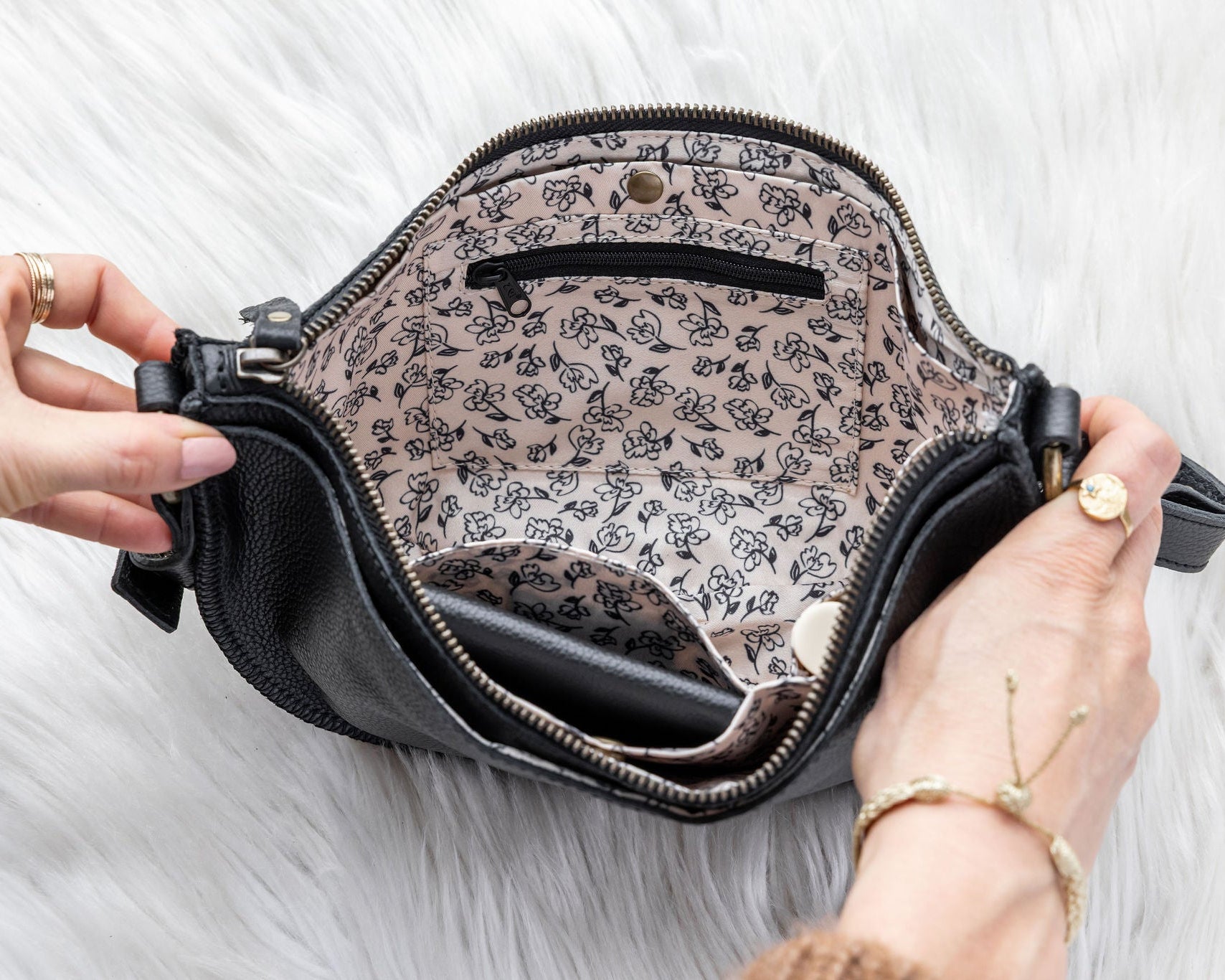 Sleek, spacious, and effortlessly chic, the Black Queen Bee is our largest convertible bag — designed for those who do it all. Handcrafted from buttery black pebbled leather with a crisp ivory floral lining, she’s roomy enough for your tablet, wallet, and daily essentials while still feeling refined. Wear her crossbody, on the shoulder, or around your waist — she adapts as easily as you do.