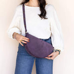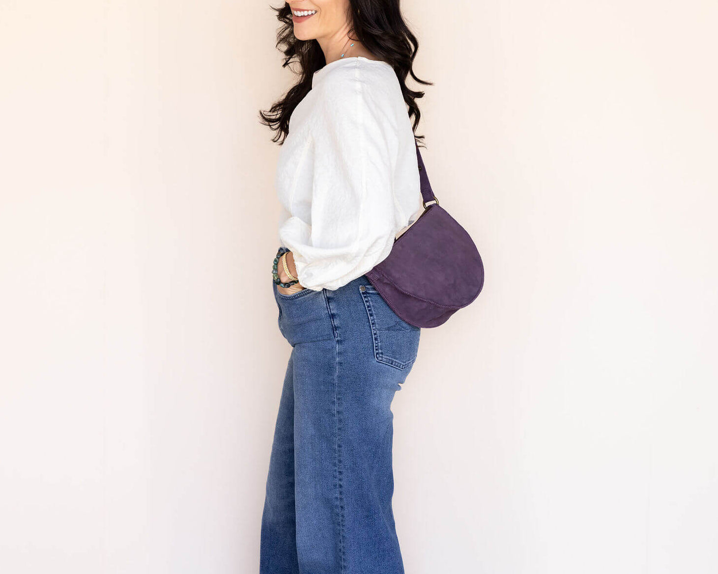 Woman wearing a purple crossbody bag against a plain background