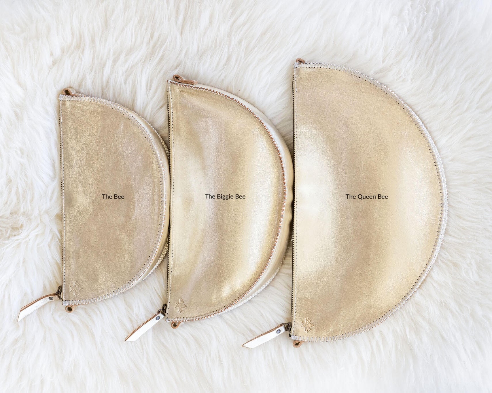 Three gold pouches labeled 'The Box', 'The Baggage Box', and 'The Queen Bee' on a white fluffy surface.