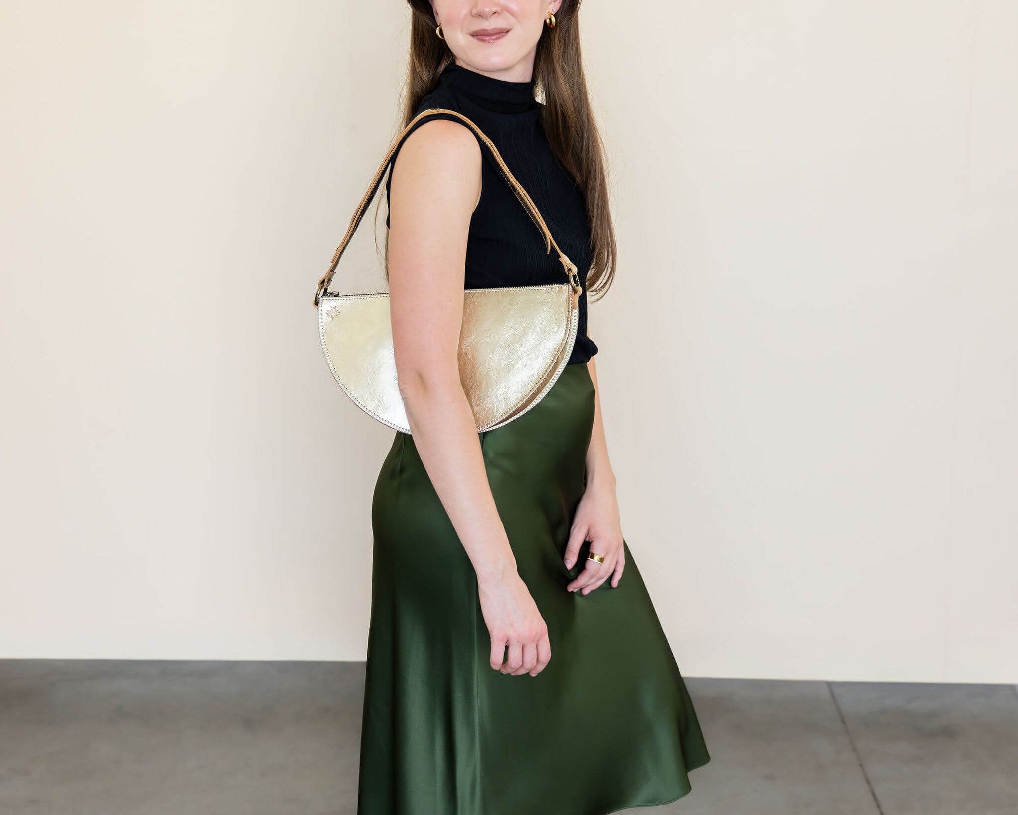 Our Metallic Leather is crafted from full-grain leather with a metallic foil and finished with a protective coating to help the shimmer last beautifully over time. This finish adds durability, but like all metallic leathers, some surface wear may occur with frequent friction or heavy, everyday use.