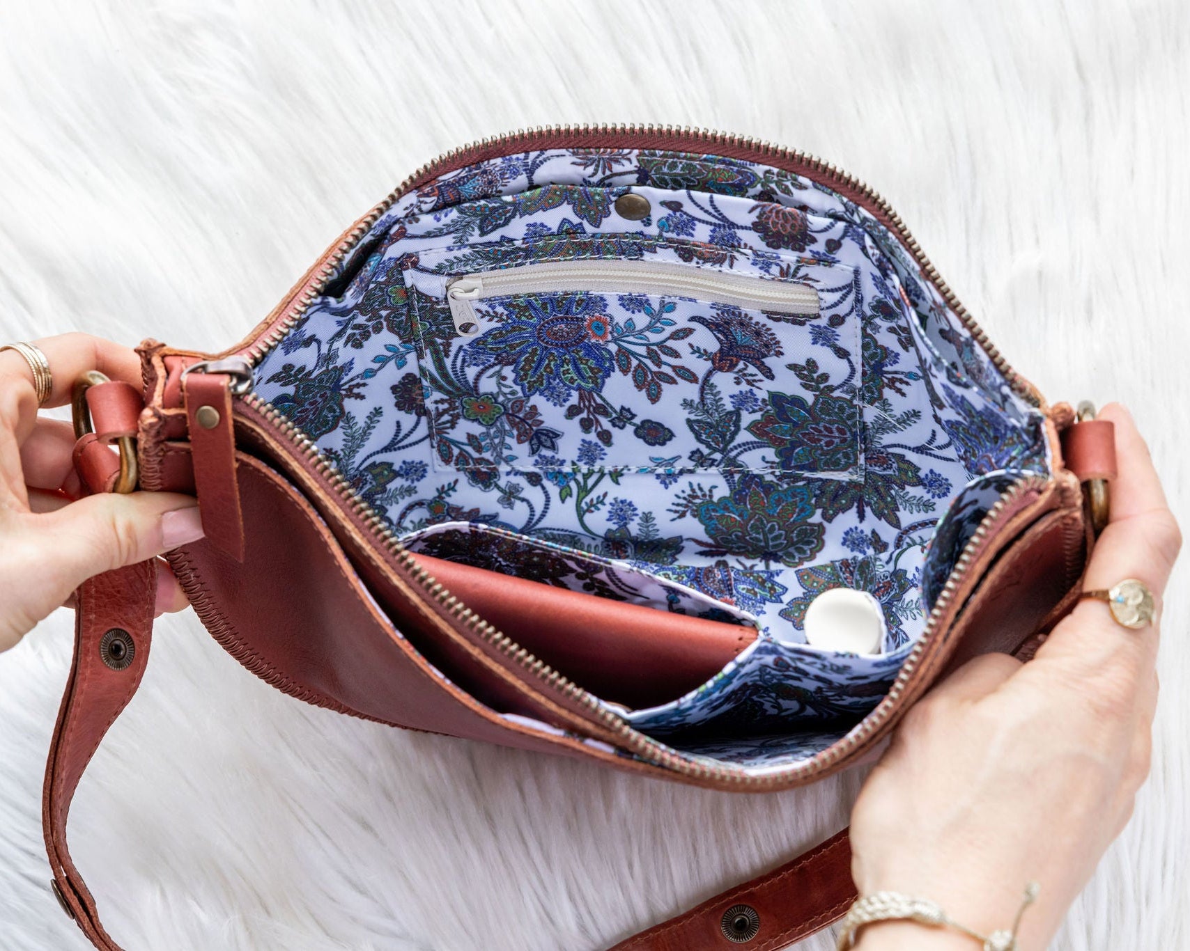 Beloved for its rich, reddish-brown hue and soft, full-grain leather, the Cognac Bee is one of our best-selling bags for good reason. Perfectly sized to hold your essentials — phone, keys, wallet, and a few extras — it’s made for days on the go and weekends away. The elegant white paisley lining adds a subtle touch of charm, while the buttery leather develops a beautiful medium patina over time.