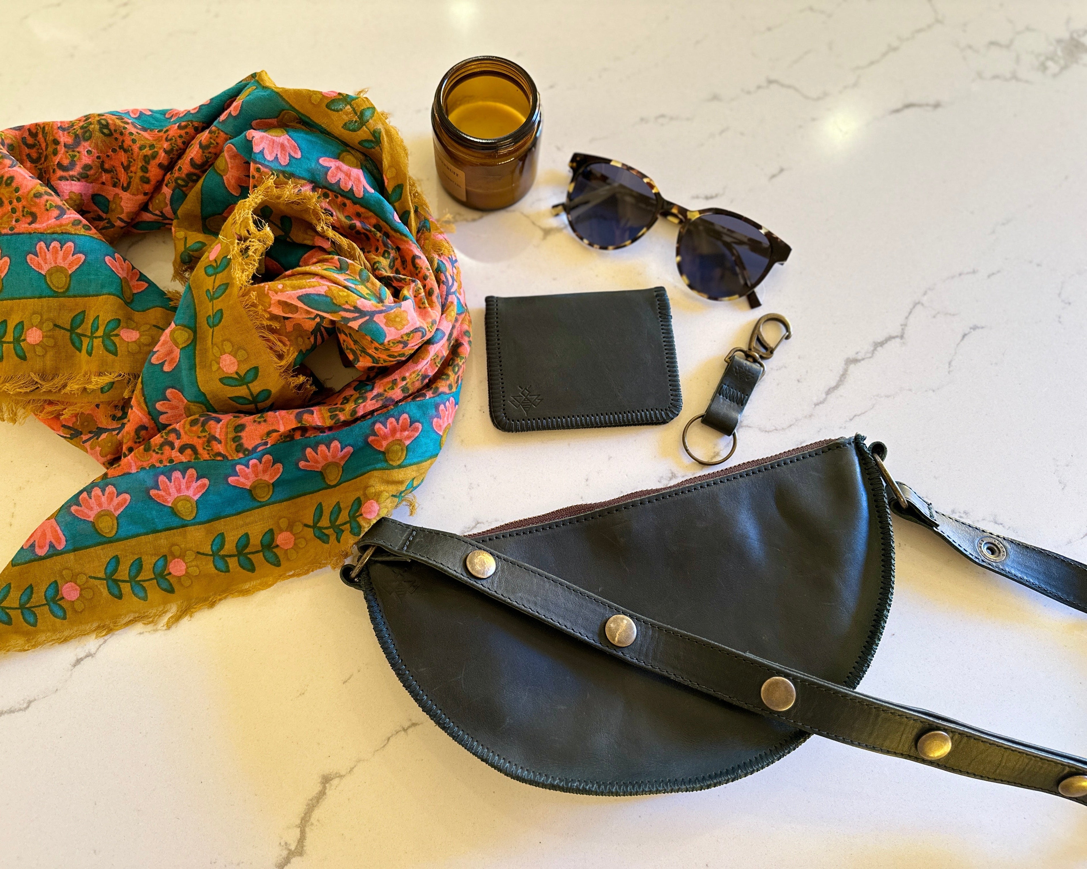 Our new limited edition keychain color. Featuring antique brass hardware, an old-fashioned swivel lobster clip, and stamped leather, this lil forest green leather keychain fits the essentials. Perfect for easy access to your keys — hook her on the o-ring of your Bee or belt loop.