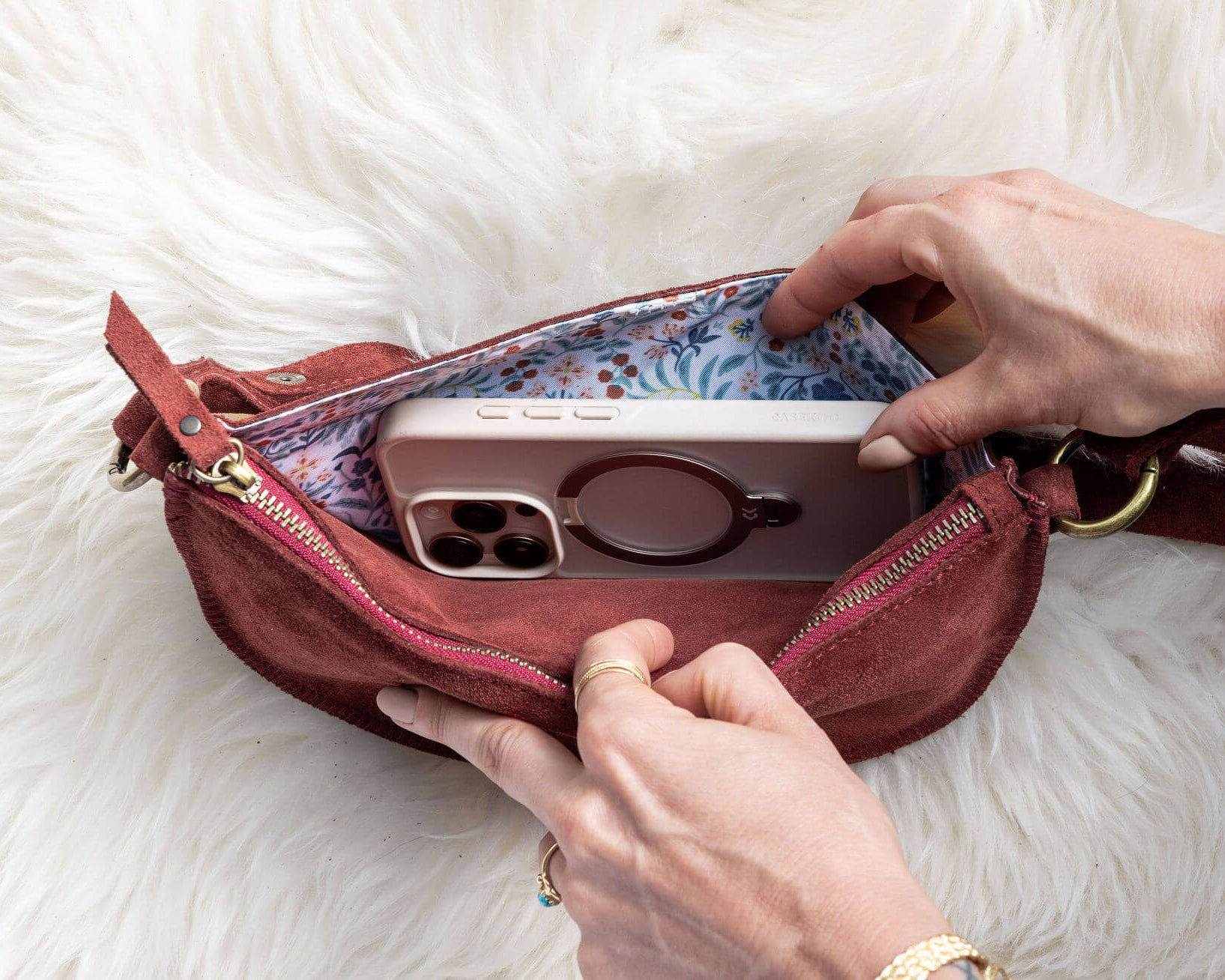 Yes! We've designed our bags to be completely reversible. With the shiny, flat side of the snap strap facing forwards, you can wear your crossbody over your left shoulder and the phone pocket will be in the back.