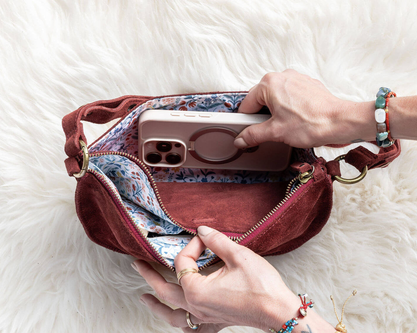 Yes! We've designed our bags to be completely reversible. With the shiny, flat side of the snap strap facing forwards, you can wear your crossbody over your left shoulder and the phone pocket will be in the back.